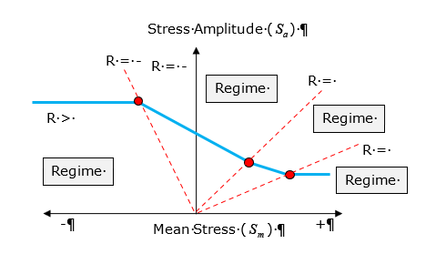 据 FKM 准则,根据应力比 (R=Smin /Smax ) 值将 Haigh 图表分为四个区域。然后使用修正后的值选择损害和寿命计算阶段的 SN 曲线。
