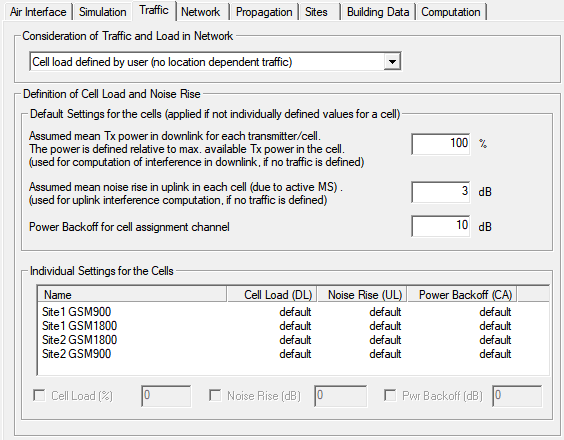 If no explicit traffic is defined, the cell load used for interference calculations can be specified in terms of the assumed mean transmit power in downlink (in percent of the maximum available transmit power of the cell together with the definition of the assumed mean noise rise) and the power backoff for the cell assignment channel. These definitions can be specified either for all cells of the network or for each cell individually.
