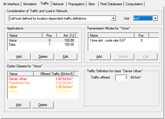 - When a clutter class is selected with the mouse the traffic values are displayed in the lower-right area. You can modify the values and thus assign them to the selected clutter class. Depending on the traffic mode specified for the current application, either two values (arrival rate in 1/sec/m² and hold time in sec) or one value (traffic in Erlang/m²) must be defined. The unit for the area definition (either m² or km²) can be modified with the drop-down list at the top of the dialog.
