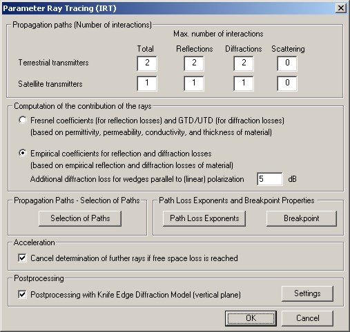 The range of the model parameters can be defined in the Settings dialog. As larger the range is, as longer the calibration will take. The model parameters depend on the selected propagation model. Each model offers individual model parameters. The following screenshot shows model parameters for the urban intelligent ray-tracing.