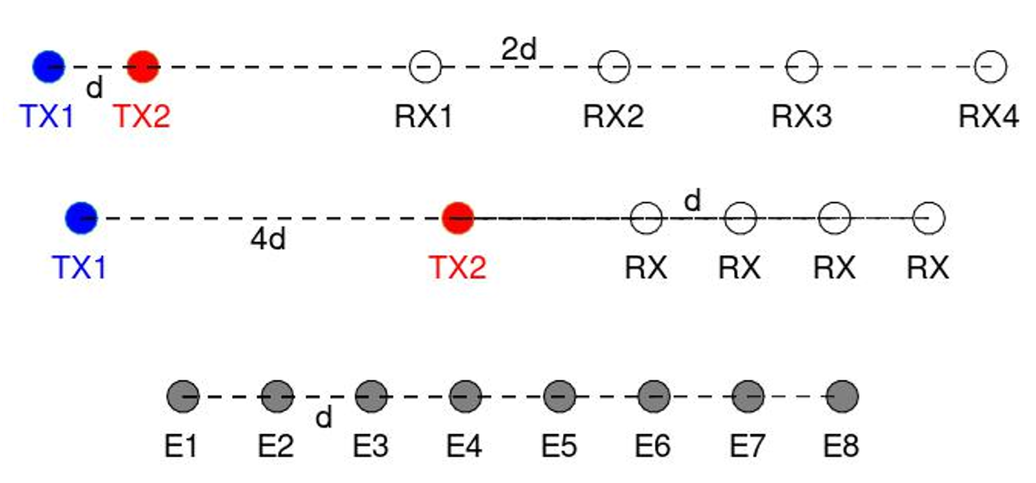 Figure 2. Here is an example of the configurations that lead to a virtual array of 8 virtual elements, each spaced by a distance of d.