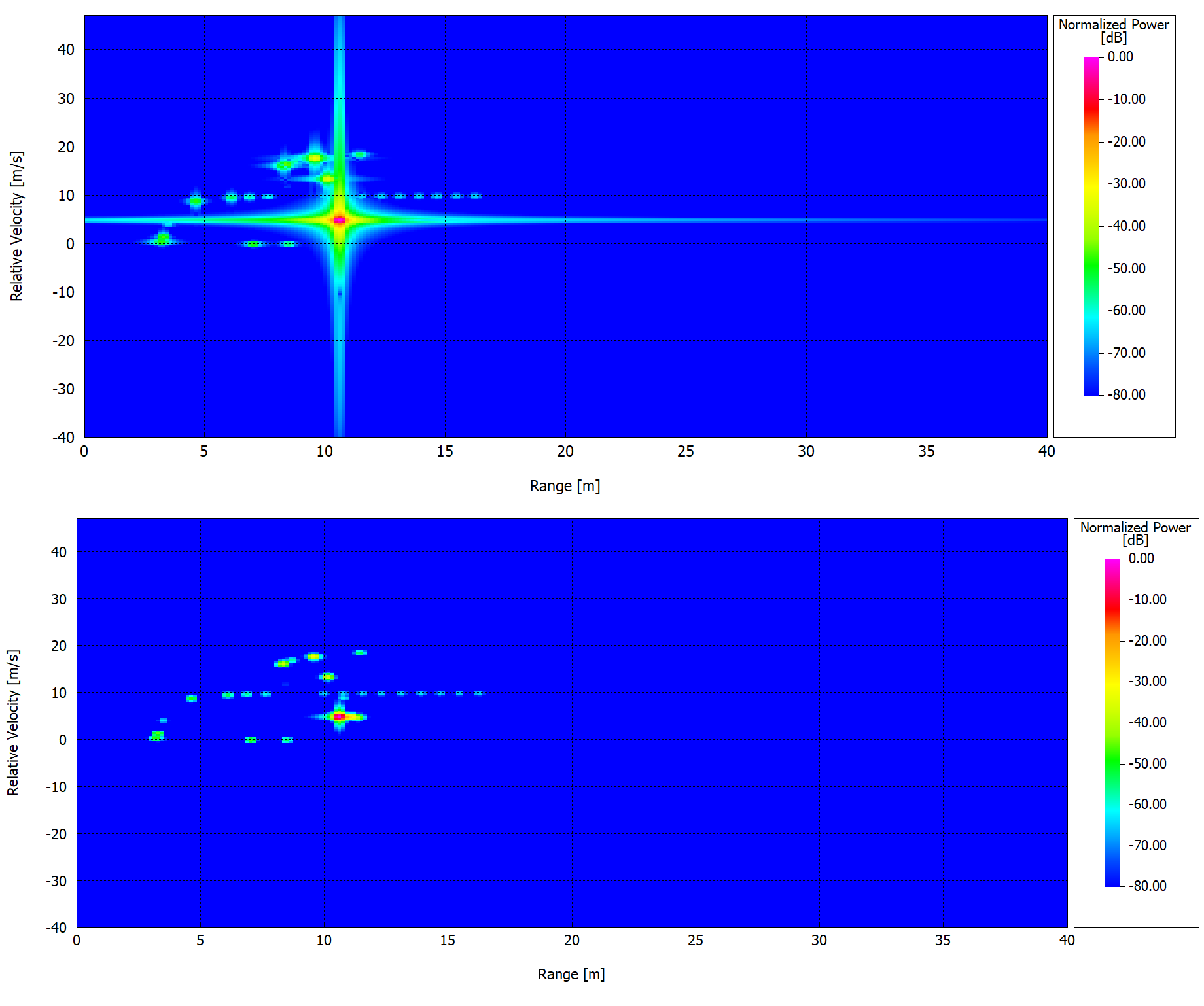 - Shows the FFT-based processed signal as a function of range and Doppler, with targets appearing as peaks in the Doppler-range map.